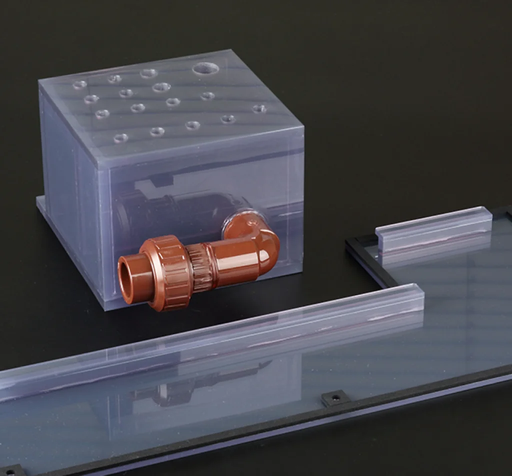 汎用樹脂の切削、組立、接着、曲げ、溶接により立体構造に作り上げます。半導体装置、ディスプレイ装置、リードフレーム処理装置などの処理槽、キャビネット、タンクなど大型の樹脂加工品を得意としています。